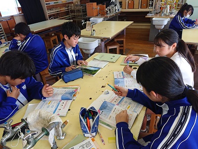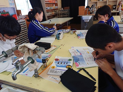 1年生は理科で「水溶液」という単元を学習しています。物質の溶解について、水溶液、溶質、溶媒、溶解などの語句の確認をしていました。