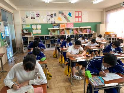 2年生の「補充学習(朝の潮風)」の様子です。英語の復習を行っていました。