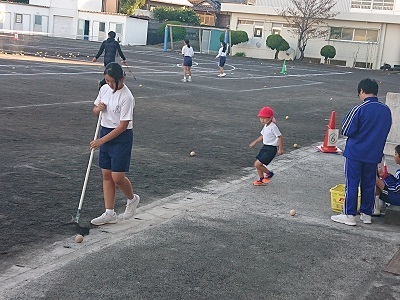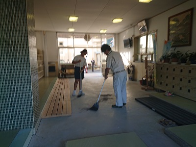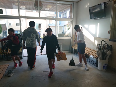 委員会活動の様子です。学習環境委員と用務員さんが玄関掃除を丁寧に行っています。いつもありがとうございます。
