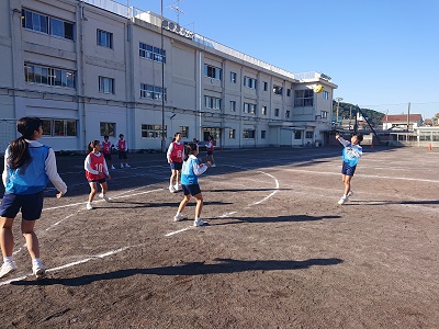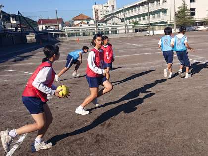1年生は体育でハンドボールを行いました。最初に3人組でパス回しゲームを行い、気持ちを高めました。