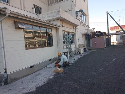 今朝、業者の方が屋外防犯灯照明修理を行いました。今後、夜になるとLED照明が校舎を明るくしてくれます。