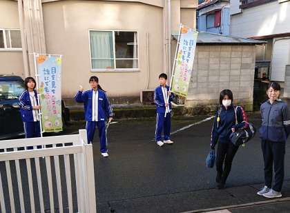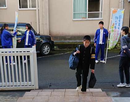 生徒会役員の生徒と教員が玄関先で「朝のあいさつ運動」を行いました。生徒同士で元気に声を掛け合っていました。