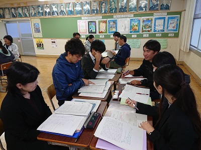 放課後、音楽室で小中合同研修会を開きました。