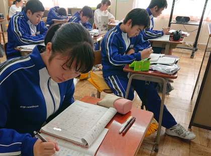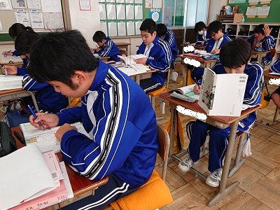 2年生は国語で「平家物語」について学習しています。今日は期末テストに向けて、ワークノートを使いながら既習事項の確認を行いました。