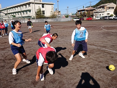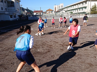 1年生は体育でハンドボールを行いました。最初に3人組でパス回しゲームを行い、気持ちを高めました。