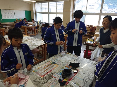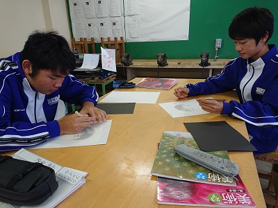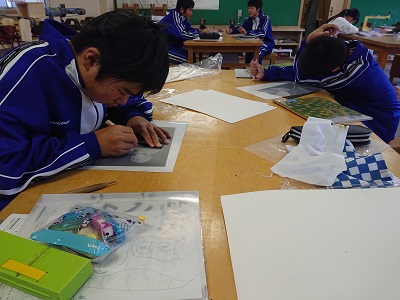 2年生は美術で「私との対話」という単元を学習しています。想像力を働かせながら、自画像制作など表現活動を行っています。墨をつけ版画を刷る生徒もいます。