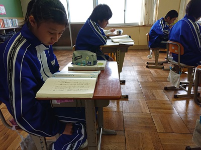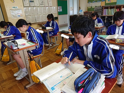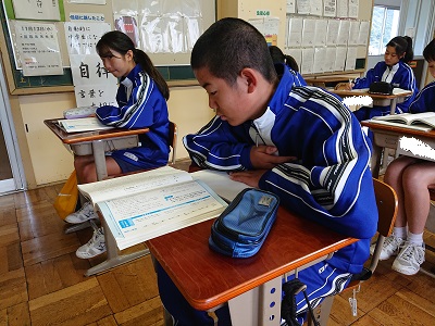 1年生は国語で「竹取物語」について学習しています。文章を読み取り、理解を深めています。