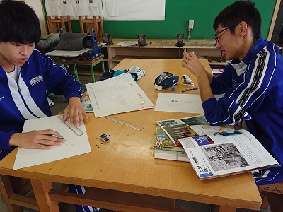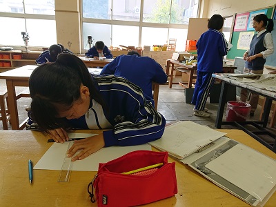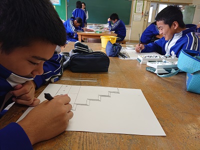 3年生は美術で「空想の世界への誘(いざな)い」という題材を学習しています。線遠近法、等角投影図法、一点透視図法、二点透視図法などの図法を用いて表しています。