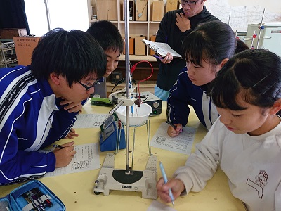 実験では、電熱線を使って水を加熱し、その温度変化の推移を記録しました。実験で分かったことをグラフに書き込みました。
