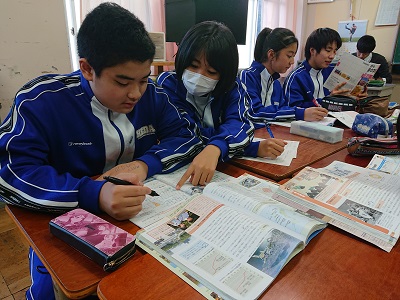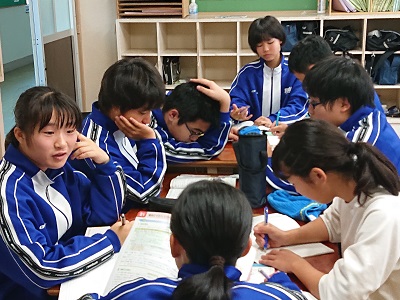 期末テストが明日に迫りました。テスト対策として助け合い学習を行い、復習をしています。