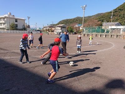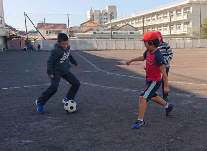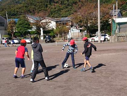 昼休みの様子です。小学生はグラウンドでボール遊びやおにごっこをして楽しんでいます。
