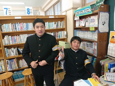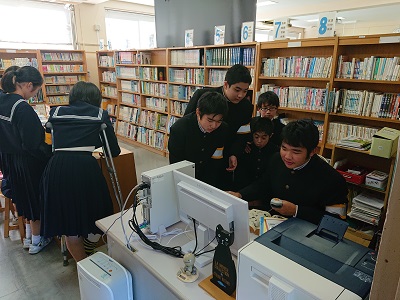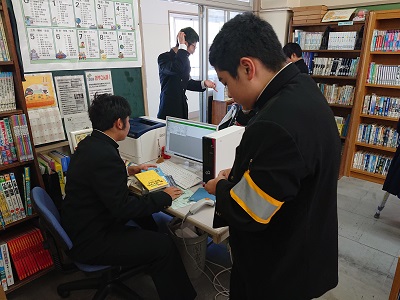 昼休みの学校図書館の様子です。学習環境委員が本の貸出業務を行っていました。