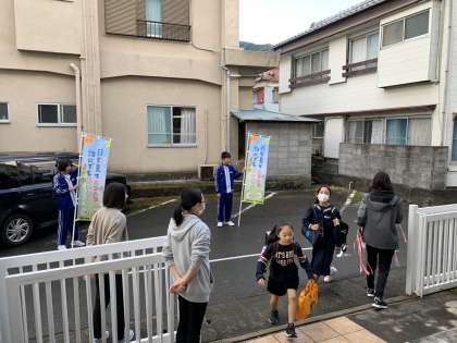 児童生徒と教員が玄関先で「朝のあいさつ運動」を行いました。生徒同士で元気に声を掛け合っていました。