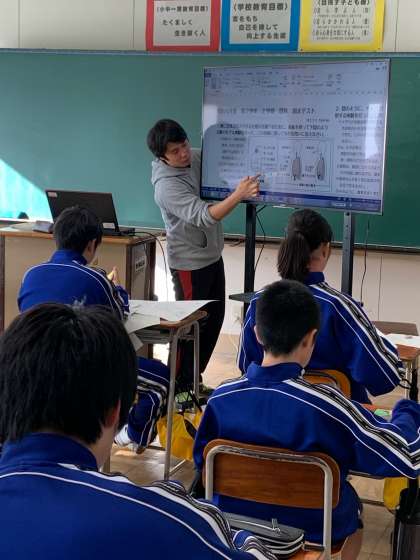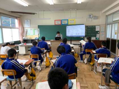 2年生は理科で期末テスト返却がありました。ICT機器を利用して、テスト用紙を大きく映し出しながら解説していました。