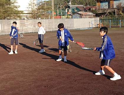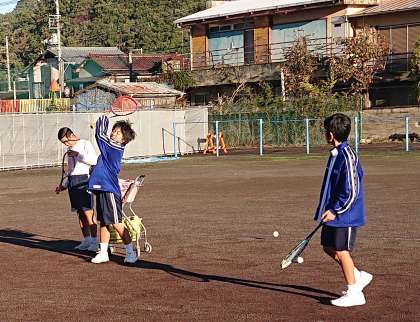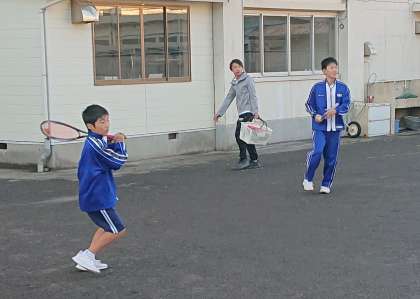 ソフトテニス部の朝練習の様子です。一球一球を真剣に打ち込んでいます。