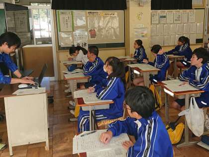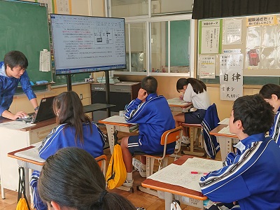 1年生は理科で期末テスト返却がありました。ICT機器を利用して、テスト用紙を大きく映し出しながら解説していました。