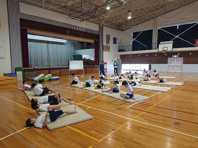小5・6年生の体育「マット運動」を、中学校勝呂先生と小学校福世先生がティームティーチングで教えています。