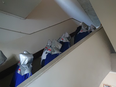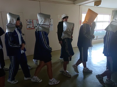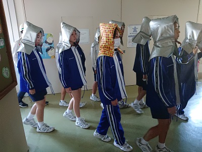 避難訓練の様子です。防災頭巾を被り、屋上へ避難しています。