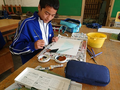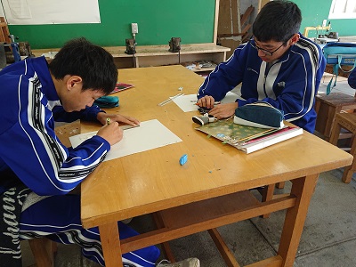 3年生は美術で「空想の世界への誘(いざな)い」という題材を学習しています。線遠近法、等角投影図法、一点透視図法、二点透視図法などの図法を用いて表しています。