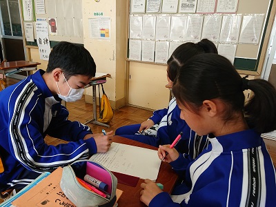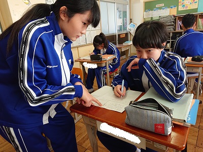 1年生は数学で「比例・反比例の利用」の演習問題について、その解を友達と話し合いました。