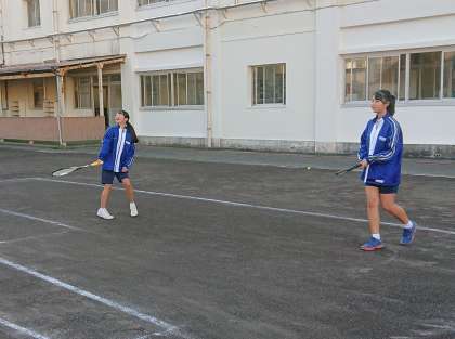 ソフトテニス部の様子です。2年生が高校訪問会出席のため、1年生のみで練習を行っています。女子は、勝呂先生の高速サーブを打ち返していました。