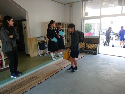 児童生徒と教員が玄関先で「朝のあいさつ運動」を行いました。生徒同士で元気に声を掛け合っていました。