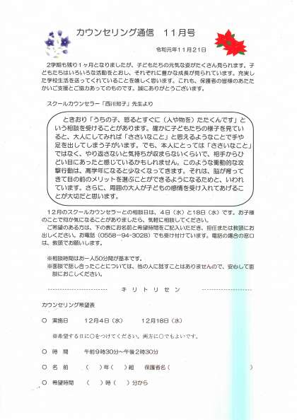 本日、カウンセリング通信11月号をご家庭に配布させていただきました。ホームページ右側の配布文書の欄にもPDFファイルで掲載させていただいております。ご覧ください。