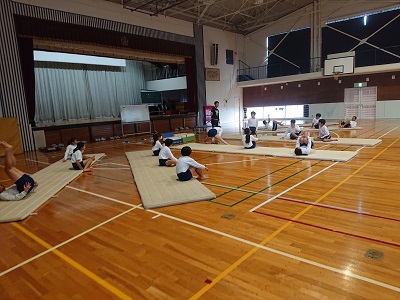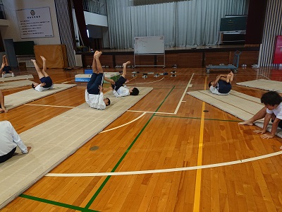 1年生は体育で「マット運動」を行っていました。技の習得に向け、基礎基本の運動に取り組んでいました。