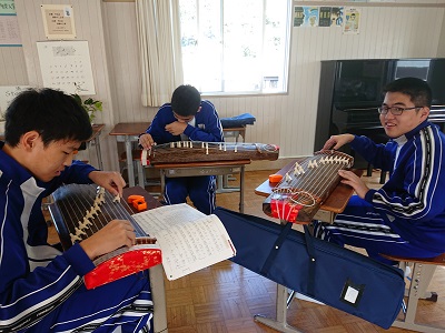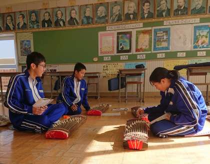 3年生は音楽で箏の学習をしています。箏を扱い、友達と協力しながら「さくらさくら」を弾いていました。