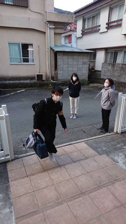 生徒が元気に登校してきました。教員が正門に立ち、生徒の様子を見守っています。
