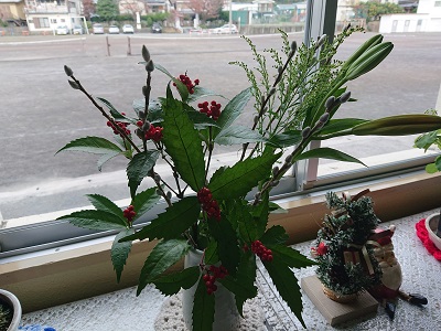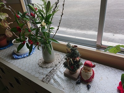 児童生徒支援員さんと事務員さんが、事務室前の棚に冬の飾り付けをしてくれました。