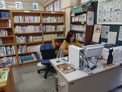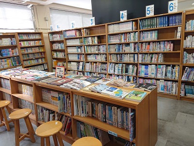学校図書館の様子です。図書館支援員さんが利用しやすいよう心を込めて整備しています。