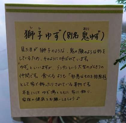 児童生徒支援員さんが用意した獅子ゆずに、栄養教諭さんがポップをしてくれました。