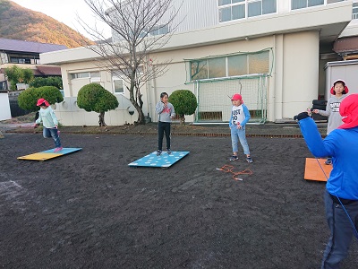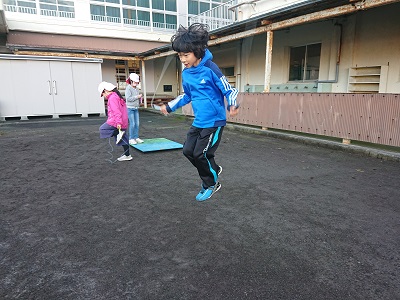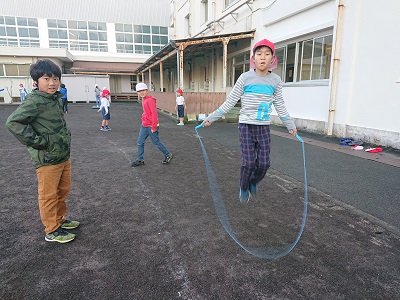 朝運動をする小学生の様子です。先週持久走大会が終わり、次はなわとびにチャレンジしています。