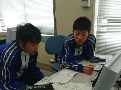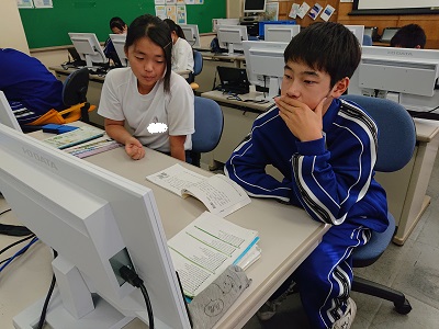 2年生は英語で英文早読みトレーニングを行っていました。読み方で分からない箇所はペアの子が教えていました。