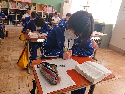 2年生は国語で「意見文を書こう」という教材を学習しています。今日は、集めた資料をもとに意見文を書きました。