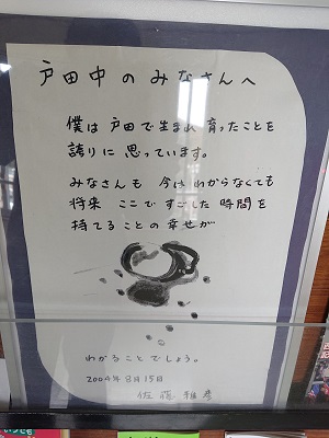 図書室前に掲示してある額です。戸田中の大先輩・佐藤雅彦様からいただいたメッセージです。