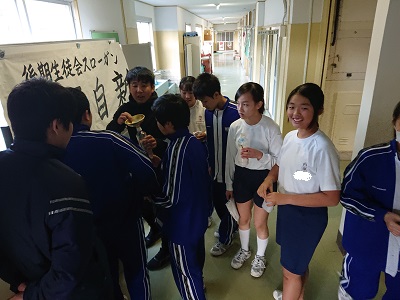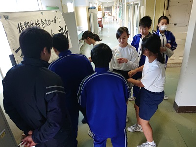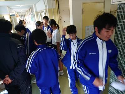 本日の放課後、普通教室と特別教室のワックスがけを行いました。最初に渡部先生と石井先生からペットボトルに入ったワックスが代表の生徒に配布されました。