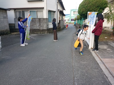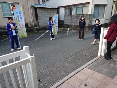 児童生徒と教員が玄関先で「朝のあいさつ運動」を行いました。生徒同士で元気に声を掛け合っていました。
