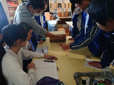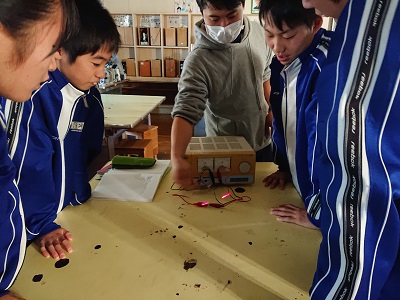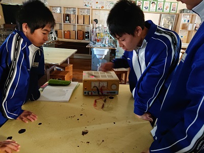 2年生は理科で「電流と磁界」という単元を学習しています。今日は、色の違う2色の発光ダイオードを使って、直流と交流の違いを調べました。