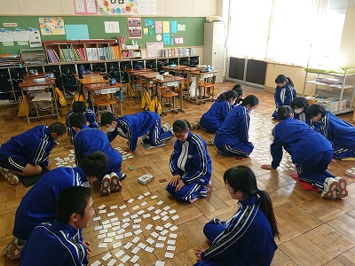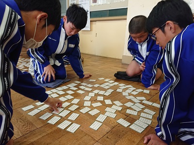 1年生は国語で、1月に開催される百人一首大会に備えて、実際に百人一首を行いました。