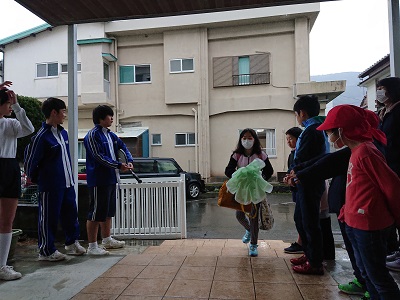 児童生徒と教員が玄関先で「朝のあいさつ運動」を行いました。小中学生が元気に声を掛け合っていました。