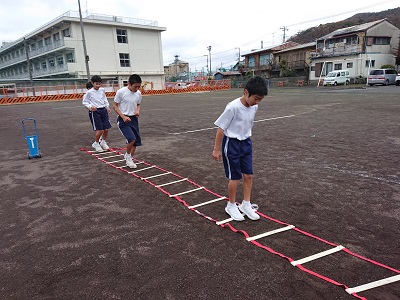 男子はラダートレーニングで足腰を鍛えています。