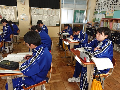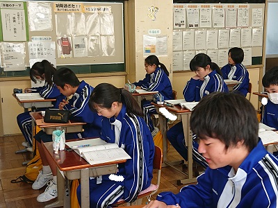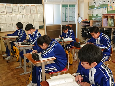 1年生は数学で「図形の性質」について学習しました。対称移動を用いた問題に取り組んでいました。