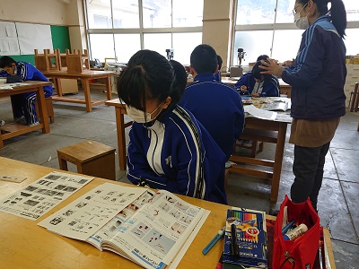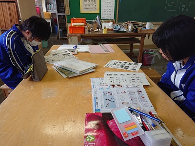 3年生は美術で、「空想の世界への誘(いざな)い」作品を完成させ、篆刻に入った生徒が下書きを行っていました。