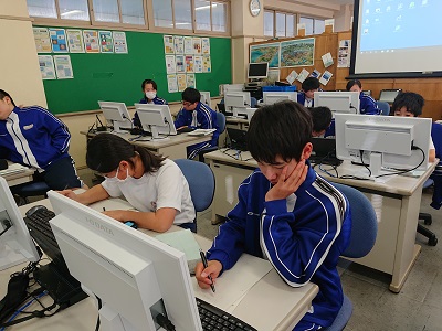 2年生は技術で「生産育成に関する技術」について学習を進めています。今日は、作物が良く育つ環境を調べるために、インターネットを使いながら学習を進めました。