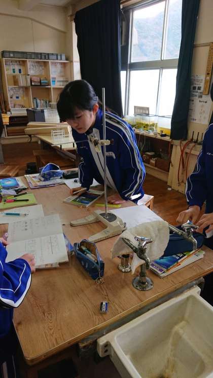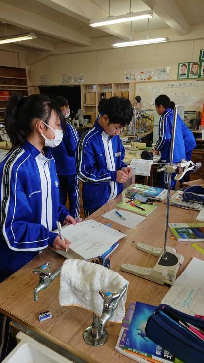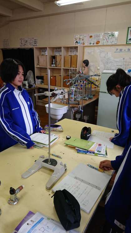 1年生は理科で「身近な物理現象」という単元を学習しています。今日は、ばねの伸びから、ばねにかかる力を観察しています。ゴーグル、台布巾、ピンセットなど、様々なもので実験しています。
