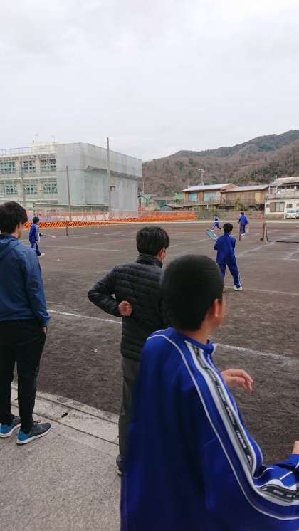 ソフトテニス部の朝練習の様子です。練習の様子を6年生の杉山先生も見守っていました。