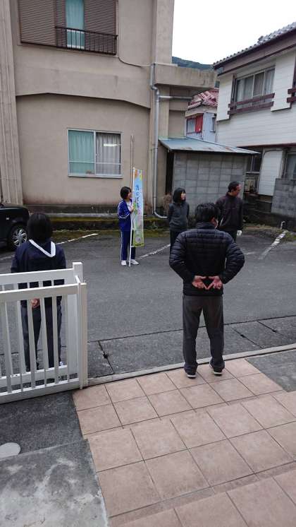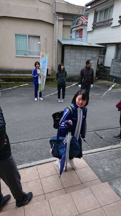 生徒と教員が玄関先で「朝のあいさつ運動」を行いました。中学生が元気に声を掛け合っていました。