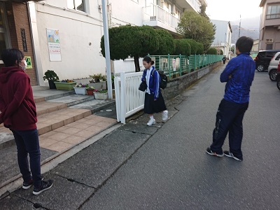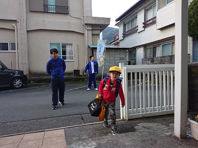 小中学生が元気に登校してきました。北垣先生が小中学生に優しく声をかけていました。お散歩のワンちゃんも可愛がってあげていました。
